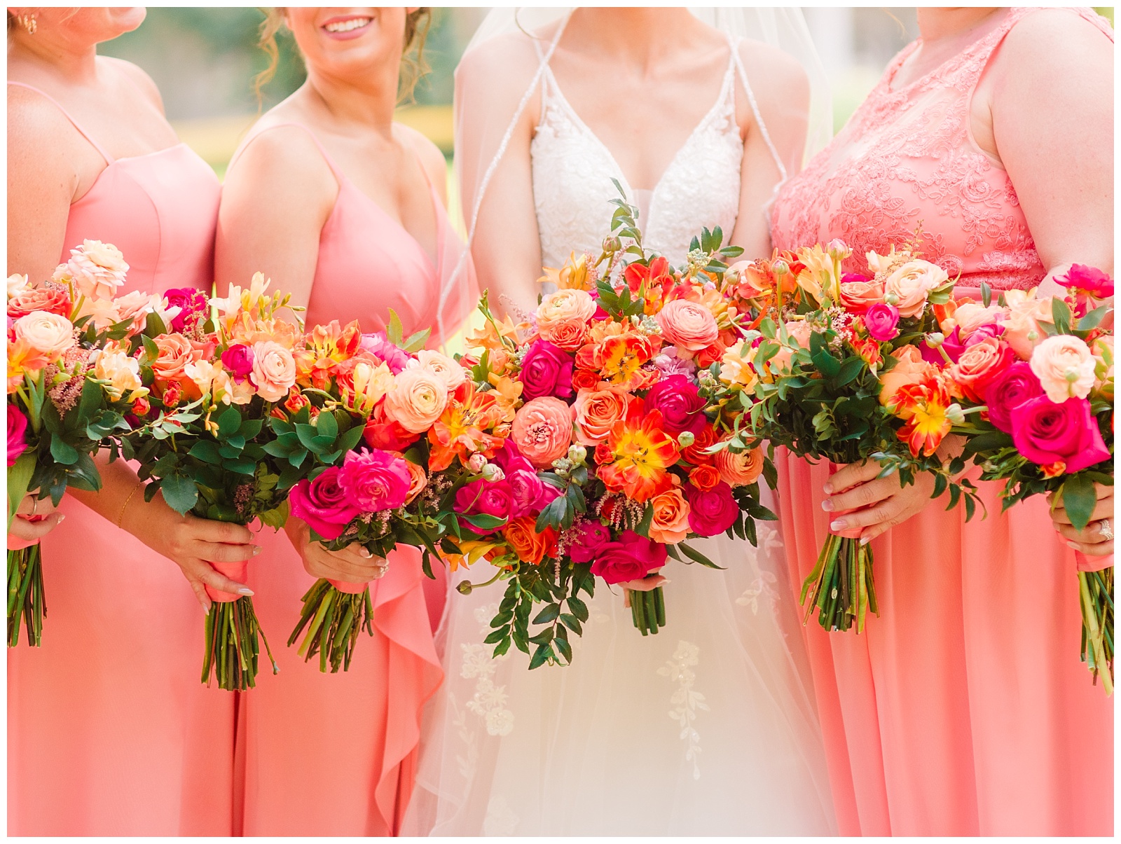 The bridesmaids wore soft coral gowns paired with vibrant florals that brought warmth to the day. The palette felt joyful without overpowering the setting.